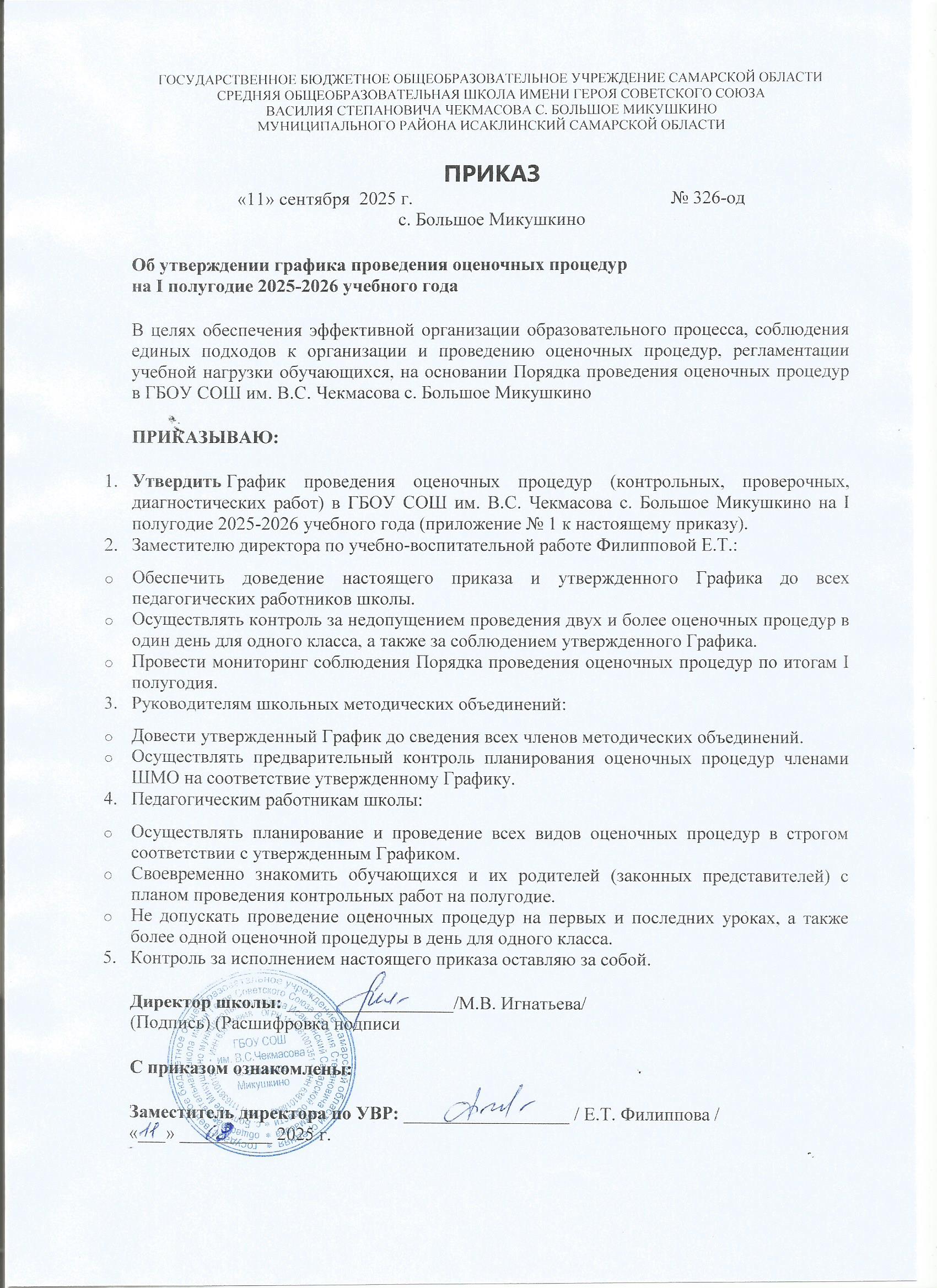 В целях упорядочивания системы оценочных процедур, проводимых в ГБОУ СОШ им. В. С. Чекмасова с. Большое Микушкино